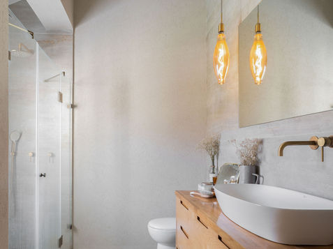 בחרתי בחומרים טבעיים, צבעים רכים, וטקסטורות שמזמינות נשימה עמוקה ושקט פנימי.